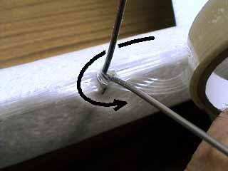 前から貼ってきたテープは、ピアノ線を回してUターンさせて前に貼り付けます。